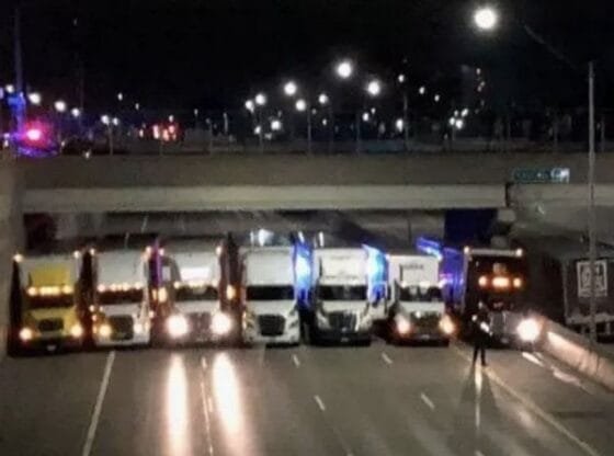 The truckers lined up across the east-bound lanes of the highway, with police closing the west-bound lanes as more semi-trucks arrived. 13 big rig truck drivers remained parked under the overpass for several hours until the man was safely escorted to a nearby hospital by police.