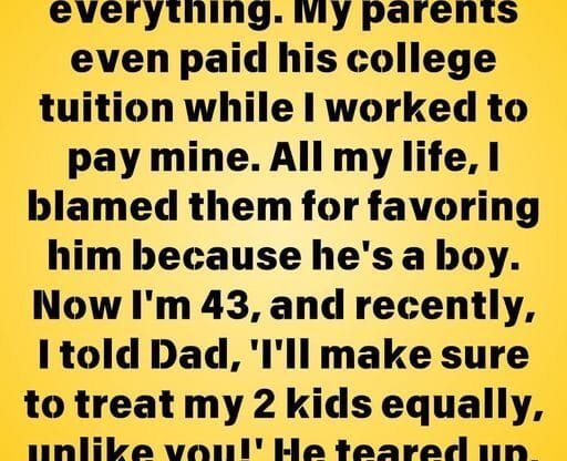 Now I’m 43, and recently, I told Dad, “I’ll make sure to tre:at my 2 kids equally, unlike you!”
