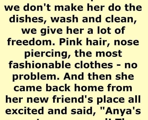 Our daughter is 13. We raise her like a princess: we don’t make her do the dishes, wash and clean, we give her a lot of freedom. Pink hair, nose piercing, the most fashionable clothes — no problem. And then she came back home from her new friend’s place all excited and said, “Anya’s parents are so cool! They even let her cook soup!”