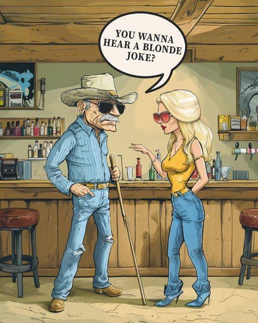 1. The Cowboy’s Blonde Joke An old, blind cowboy wanders into a biker bar and asks, “Wanna hear a blonde joke?” A woman warns him: “The bartender, bouncer, and five women here are all blonde. Still want to tell it?” The cowboy replies, “Nope, not if I’ve gotta explain it five times.”