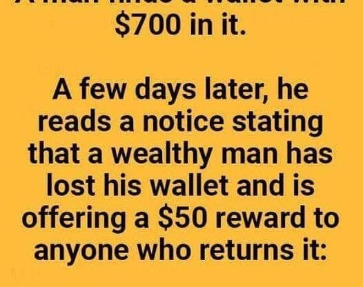 A man finds a wallet with $700 inside. A few days later, he sees a notice from a rich man who lost his wallet and is offering a $50 reward to whoever returns it. The man finds the owner and hands back the wallet. The rich man counts the money and says, “I see you’ve already taken your reward.”