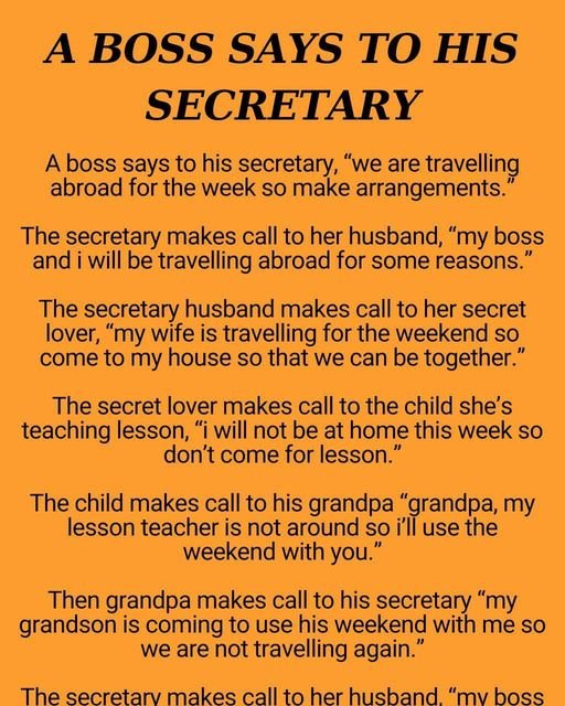 A boss says to his secretary A boss says to his secretary, “we are travelling abroad for the week so make arrangements.”The secretary makes call…
