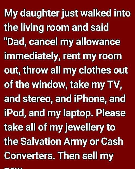 “Dad, cancel my allowance immediately, rent out my room, throw all my clothes out the window, and take my TV, stereo, iPhone, iPod, and laptop,”…
