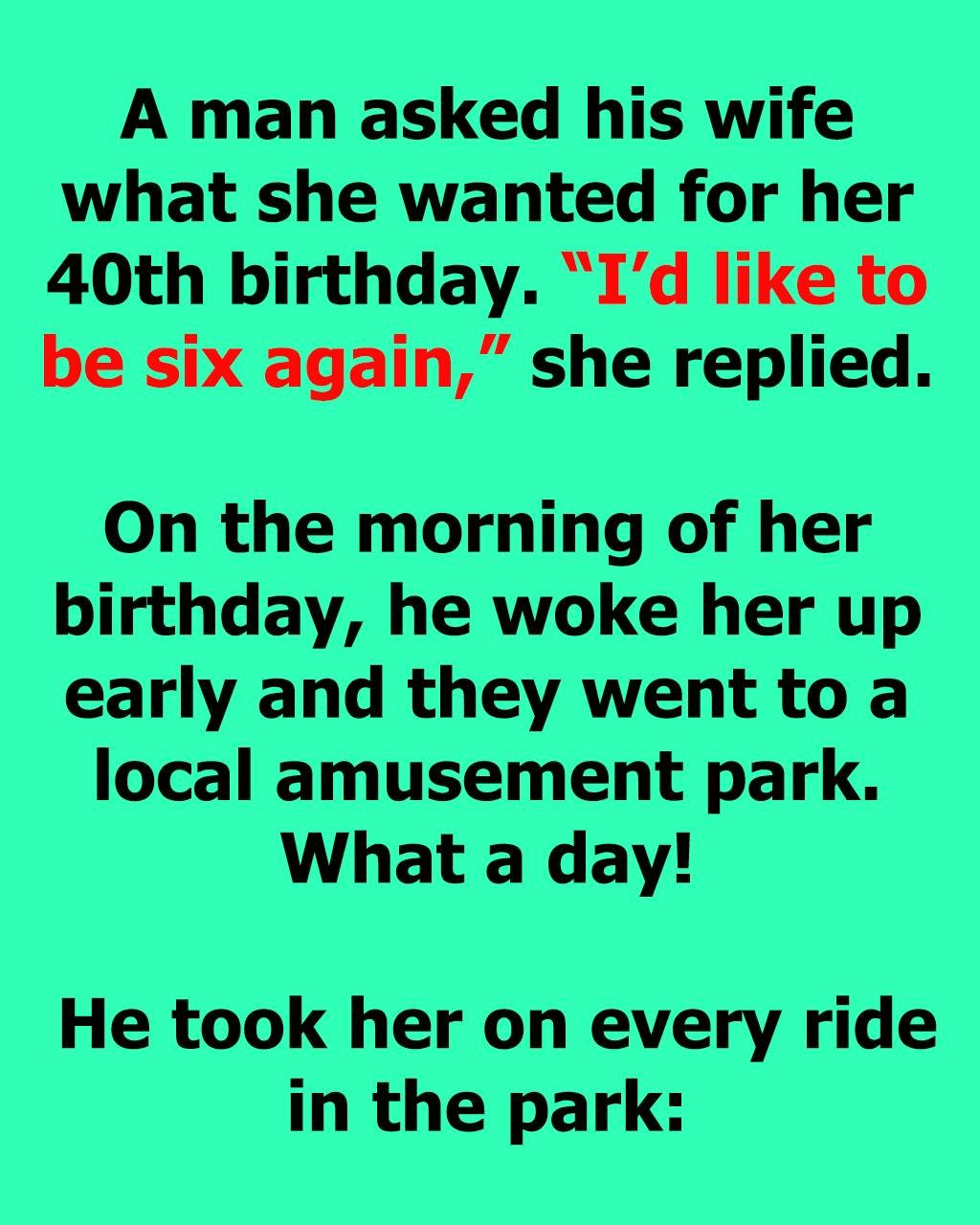 A man asked his wife what she wanted for her 40th birthday. “I’d like to be six again,” she replied. On the morning of her…