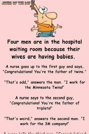 Four men are at the hospital because their wives are expecting babies. A nurse approaches the first man and says, “Congratulations, you’re a father of…