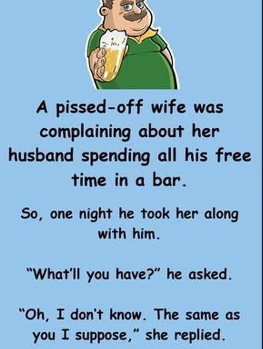 A irate wife complained that her husband spent all of his free time in a pub. So one night, he took her with him. “What’ll…