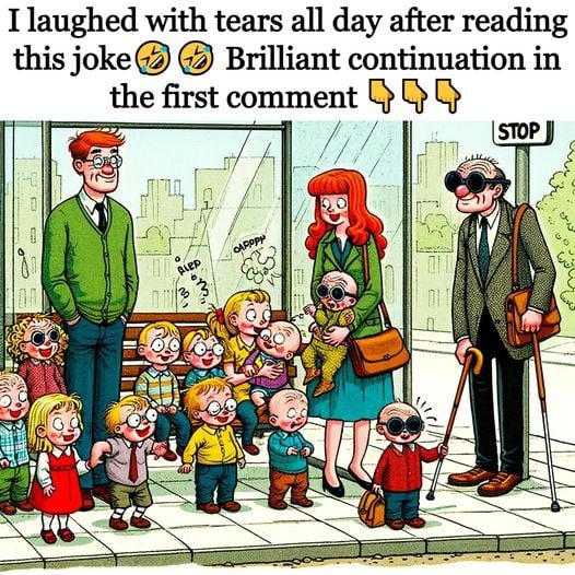 A husband and wife are waiting at the bus stop with their nine children. A blind man joins them after a few minutes. When the…