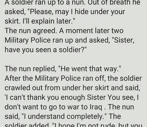 A soldier ran up to a nun. Out of breath, he asked, “Please, may I hide under your skirt. I’ll explain later.” The nun agreed.…