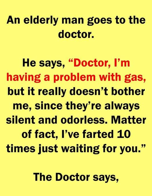 He says, “Doctor, I’m having a problem with gas, but it really doesn’t bother me since they’re always silent and odorless. Matter of fact, I’ve farted 10 times just waiting for you.”