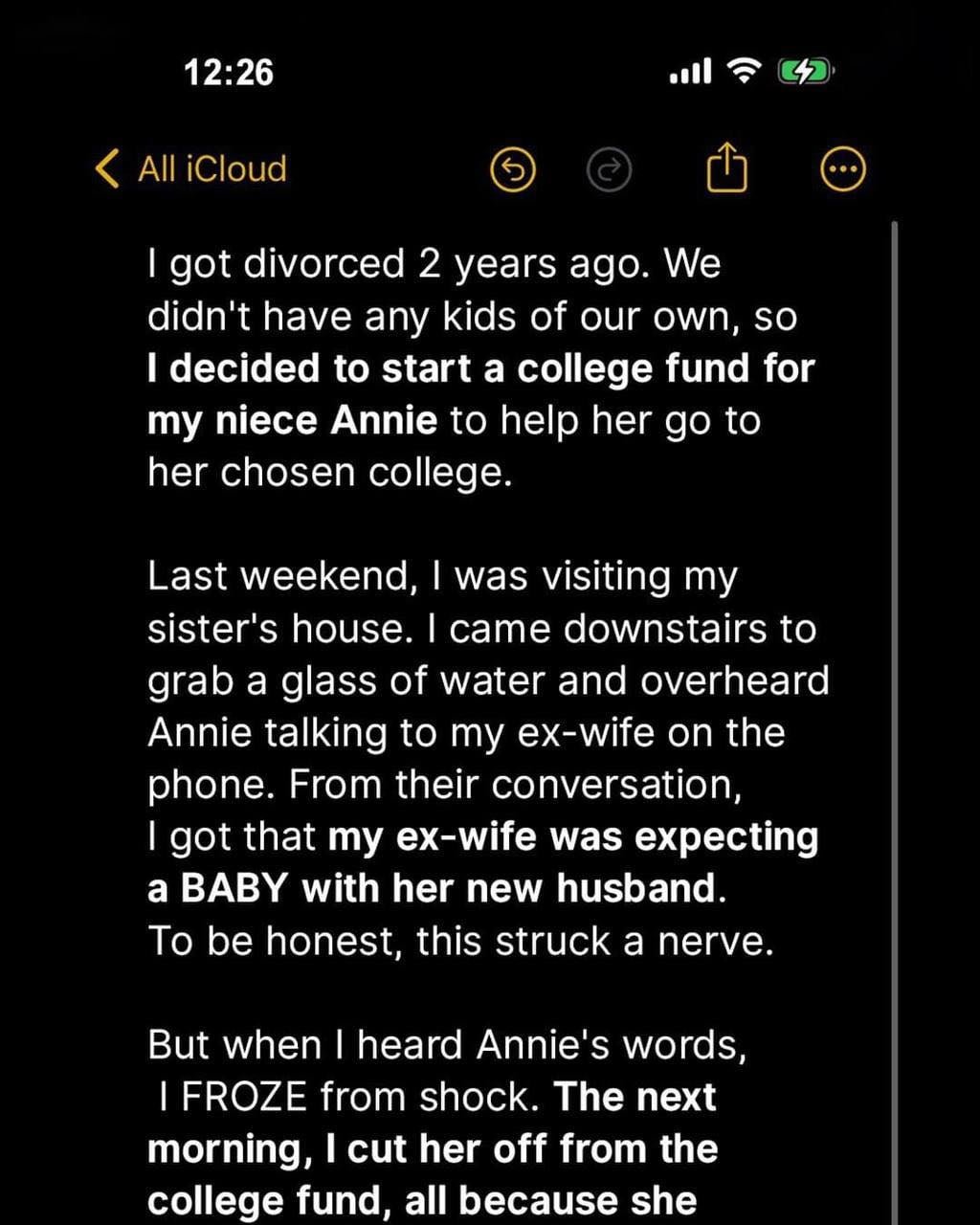 Hi there, this is Raymond. I am thirty-five years old, and I have always been the “family guy,” watching out for everyone. Due to infertility problems that my ex-wife, Darin, and I experienced two years after our divorce, I took comfort in helping my niece, Annie, who is like a daughter to me. In an effort to relieve her of one less stress when she heads off to her chosen college, I established a college fund for her in 2019. But everything changed during the last weekend.