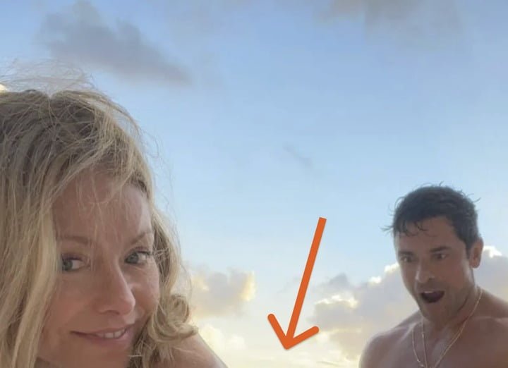 In the photo, Ripa is seen in a bathing suit bent over, while her husband is behind her seemingly stunned by the cheeky display.