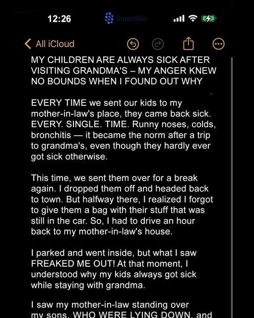When Darla’s kids kept returning from their grandmother’s house sick, she chalked it up to weak immune systems. But after an unplanned trip back to Grandma Eileen’s to retrieve a forgotten bag, she uncovered the truth about what was really happening at her mother-in-law’s.