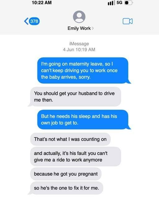 I told Emily I couldn’t keep driving her once the baby was here, and she suggested my husband should drive her instead! I said no way, he needs his sleep and has his own job to get to. She got really upset and made a joke (or so I thought) that it was his fault I couldn’t give her a ride anymore because he got me pregnant.