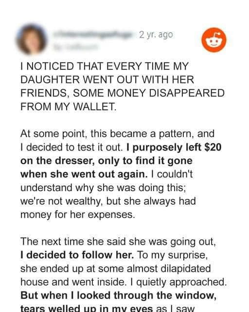 This started happening regularly, and I decided to test it out. I purposely left $20 on the dresser, only to find it gone when she went out again. I couldn’t understand why she was doing this; we’re not wealthy, but she always had money for her expenses.