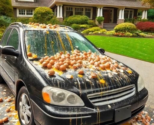 I went outside, carrying Lily on one hip and holding Lucas in my arm, when I noticed something. My car was covered in eggs! The eggshells were stuck to the gooey mess, dripping down the windshield like some gross breakfast gone wrong.