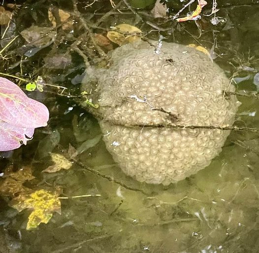 The peculiar gooey looking sacs, which appear to have thousands of eggs growing inside, are found underwater, typically attached to a branch, dock or rock.