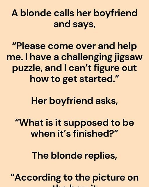 A blonde calls her boyfriend and says, “Please come over and help me. I have a challenging jigsaw puzzle, and I can’t figure out how…