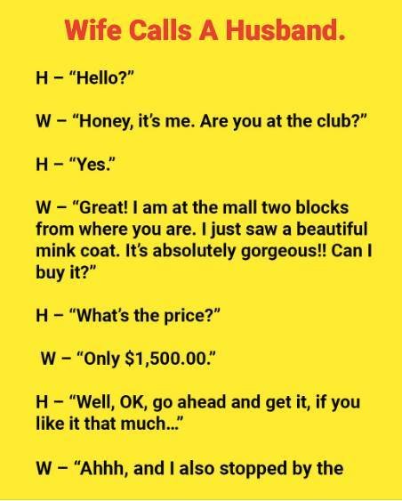 Spread the love H – “Hello?” W – “Honey, it’s me. Are you at the club?” H – “Yes.” W – “Great! I am at…