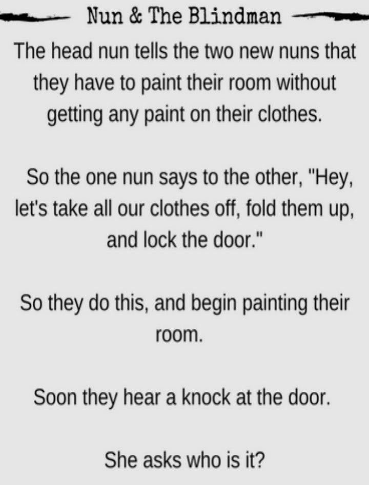 The head nun tells the two new nuns that they have to paint their room without getting any paint on their clothes. So the one…