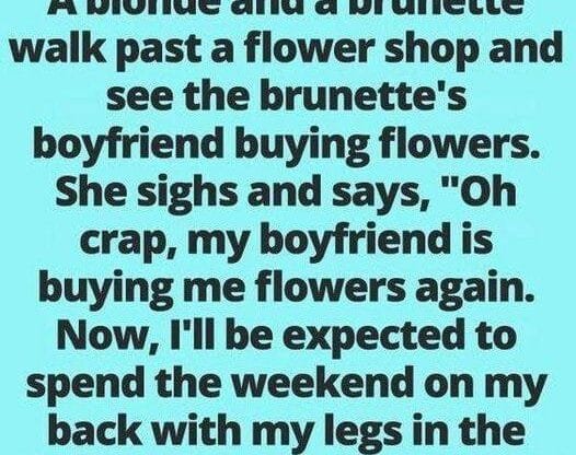 “Oh crap, my boyfriend is buying me flowers again. Now, I’ll be expected to spend the weekend on my back with my legs in the air.”