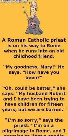 A Roman Catholic priest is on his way to Rome when he comes across an old boyhood buddy. “My goodness, Mary!” he said. “How have you been?” “Oh, could be better,” she admits. “My husband Robert and I have been trying to have children for fifteen years, but we are barren.” “I’m very sorry,” says the priest. “I’m on a pilgrimage to Rome, and I promise to light a candle for you in the great cathedral.”Mary thanks him, and they say their goodbyes after speaking for a while.