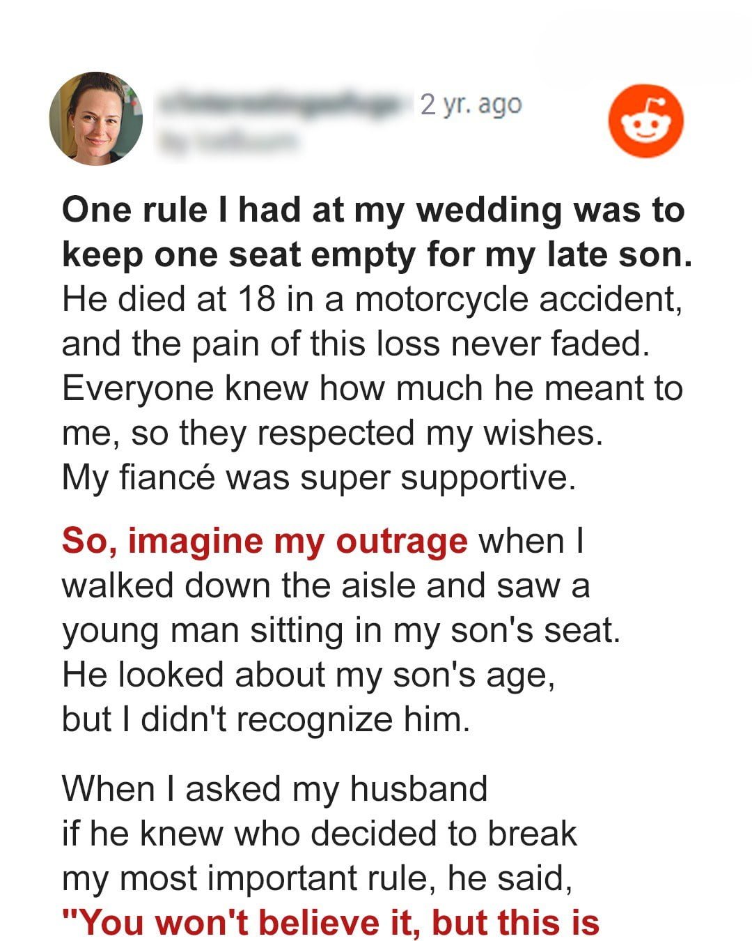 There would always be a special place for her late son, Rowley. Jennifer became a mother at 16, and Rowley was the light of her life. She never regretted having him. Unfortunately, he loved motorcycles, and on his 18th birthday, he got into an accident on the streets of Texas. He was declared brain-dead immediately. Rowley was an organ donor, so it gave Jennifer solace that part of his body still lived somehow. Her son managed to save several people because of his organs. “Honey, you literally had his heart right on the spot you planned for him.” Through the course of her grief, Jennifer met John, who supported her through everything. She knew he was the right man for her, and she wished Rowley could’ve met him. She often thought Rowley sent John so she wouldn’t be alone anymore.Jennifer planned her wedding two years after Rowley’s death, and she still wished he was there. One of her friends suggested saving an empty spot in his honor, and Jennifer thought it was the best idea possible. “That sounds great, honey. Let’s do that. You can put him next to your parents since that’s where he would be anyway,” John suggested, and Jennifer nodded with a smile. John helped her keep the memory of Rowley alive at every turn, and that’s why she fell in love with him so quickly. *** On the day of her wedding, Jennifer felt more emotional than ever. She was on the verge of tears many times, although she never knew if it was happiness or sadness that her son was not there. But she had her parents, the rest of her family, and tons of friends to support her. Moreover, Rowley would be there in spirit. The wedding march came on, and she started walking with her father, her hand on his arm, trying to hold herself steady. As she approached the end of the aisle toward John, she saw something out of the corner of her eye that jolted her. She tried to be discreet, but she couldn’t help reacting when she noticed someone sitting on Rowley’s spot.It was a young man, possibly in his early or mid-20s, and she didn’t recognize him. “Dad, who is that?” she whispered as quietly as she could. “Hush, darling. Look at John and smile,” her father responded, and Jennifer couldn’t understand. “Do you know who he is?” “Focus, Jen,” her dad said, avoiding her question again as he continued walking. When they arrived at the end, she kept herself from asking so as not to ruin the occasion. But she was insanely angry that someone was sitting on the seat she reserved for Rowley. How dare him! But it was time to get married and act happy for her future husband, who was smiling at her, and she melted like an ice cube. The minister carried on with the ceremony, the couple said their vows, and everyone cheered when they kissed at the end. The newlyweds walked down the aisle to the cheers of their family and flashes of cameras, but as soon as they got in the car, Jennifer had to bring it up. “John, do you know who was sitting on Rowley’s spot? My dad didn’t want to answer me,” she questioned, her eyes filled with concern.“I do know, my love. But I want to introduce you to him at the reception,” John answered, but his words didn’t ease her worries. “John, you know how important that spot was for me today. I worried about that all throughout the ceremony. Please, just tell me,” Jennifer begged, and John didn’t have the heart to keep it from her any longer. “Okay, okay. His name is Dave, and darling, he was the recipient of Rowley’s heart,” John revealed, and Jennifer’s eyes widened in shock. “Honey, you literally had your son’s heart right on the spot you planned for him.” “Are you serious?” Jennifer asked, unable to get the question out without catching her breath. “Yes, darling. It was my surprise for you, and Dave is dying to meet you. His mother is also here. I wanted you to have a part of Rowley in the wedding, and this is the best I could do,” John added, explaining more in detail while Jennifer tried not to bawl her eyes out. “My makeup is going to be ruined, but I’m so glad I know now,” Jennifer cried, hugging her new husband, knowing she had made the best decision of her life by choosing him.At the reception, John introduced her to Dave, who thanked her profusely, and Dave’s mother gave Jennifer the biggest hug in the world. “I don’t know how to thank you for your sacrifice. But I’ll be grateful forever,” the woman said, tears falling from her eyes. “Thank you for coming here,” Jennifer told them, her tears marring her makeup, but she didn’t care anymore. She could fix it in a second. While everyone was having dinner and rejoicing during the reception, Dave gave Jennifer a stethoscope, so she could listen to Rowley’s heart beating. She cried once again and felt like Rowley was actually there in more than just his spirit. Dave and Jennifer kept in touch over the years, and she was always glad to know that her son lived on in some ways.